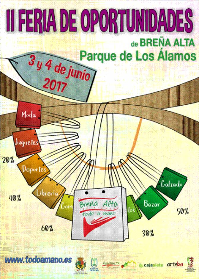 Breña Alta celebrará los próximos 3 y 4 de junio, en el Parque de Los Álamos en San Pedro, la segunda edición de su Feria de Oportunidades, una excelente oportunidad para conseguir artículos con grandes descuentos y a precio de saldo, aprovechando la liquidación de stocks que realizan las empresas por cambio de temporada.