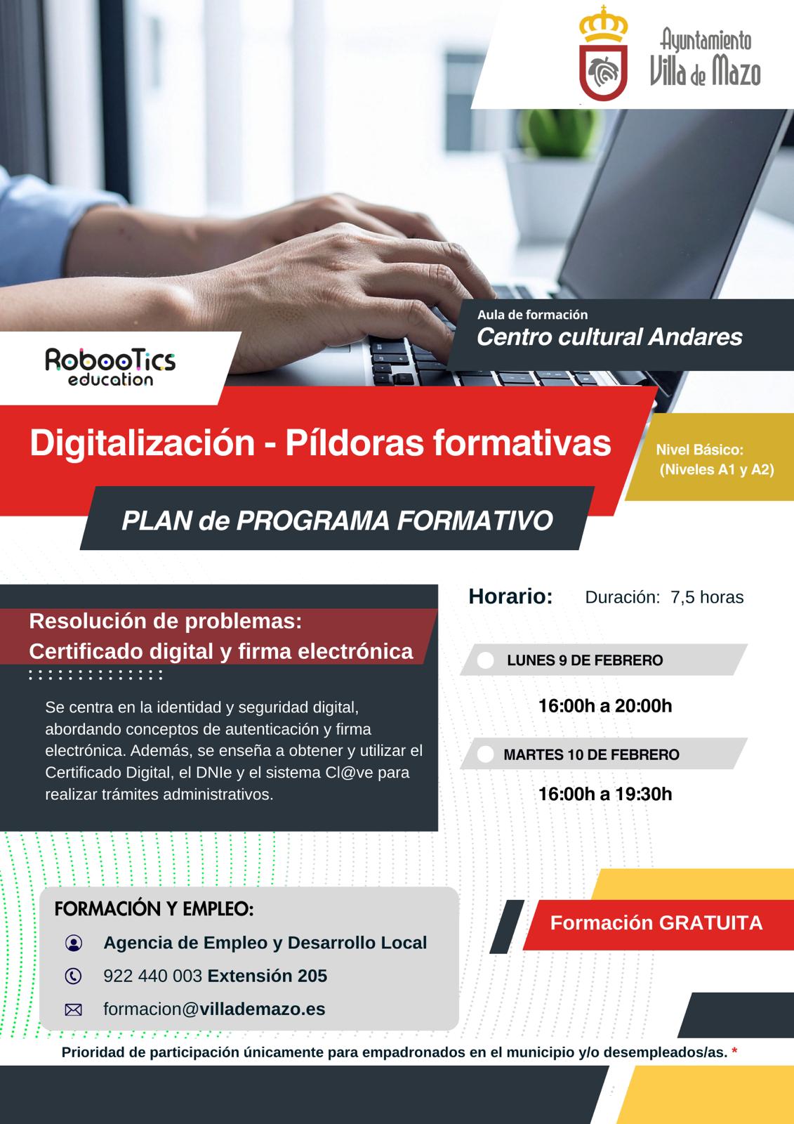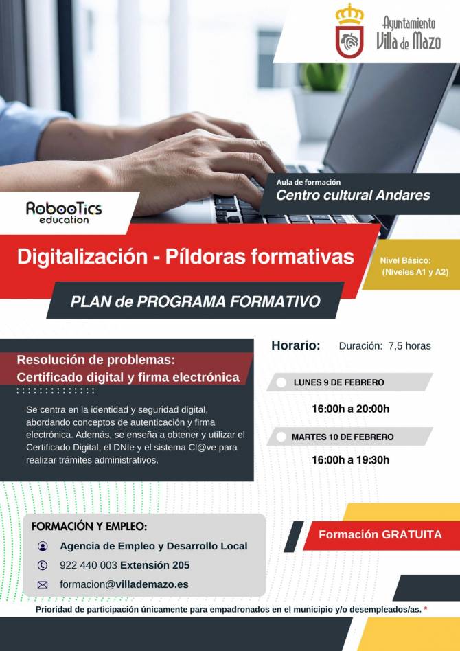 Villa de Mazo da un paso más en la apuesta por la digitalización y la formación de su ciudadanía con la puesta en marcha de un programa formativo centrado en la identidad y seguridad digital. La iniciativa, que se desarrollará en el Centro Cultural Andares, está dirigida a la obtención y uso del Certificado Digital, el DNI Electrónico y el sistema Cl@ve. El curso se impartirá el lunes 9 de febrero de 16:00 a 20:00 horas y el martes 10 de febrero de 16:00 a 19:30 horas.