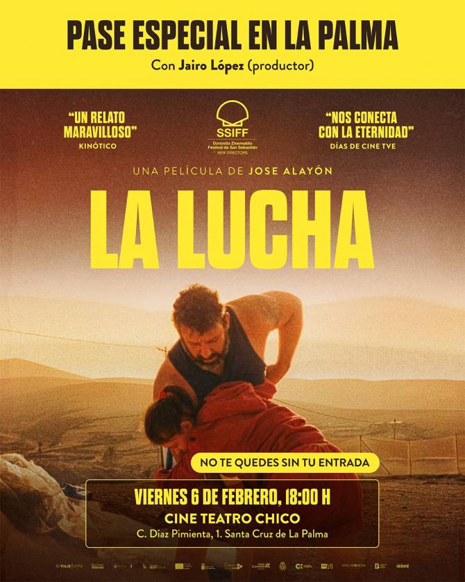 La Lucha, de Jose Alayón, amplía su presencia en La Palma durante la segunda semana en las salas de cine de Canarias. Así, además de mantenerse en los Multicines Millennium de Los Llanos de Aridane con una pase diario a las 19.00, este viernes, 6 de febrero, comienzan las proyecciones en el cine Teatro Chico, en Santa Cruz de La Palma, donde la presentación arranca a las 18.00 horas, con un pase especial a cargo del productor del filme, el palmero Jairo López, que mantendrá un coloquio con los espectadores, y donde permanecerá toda la semana también con un pase diario a las 18.00.