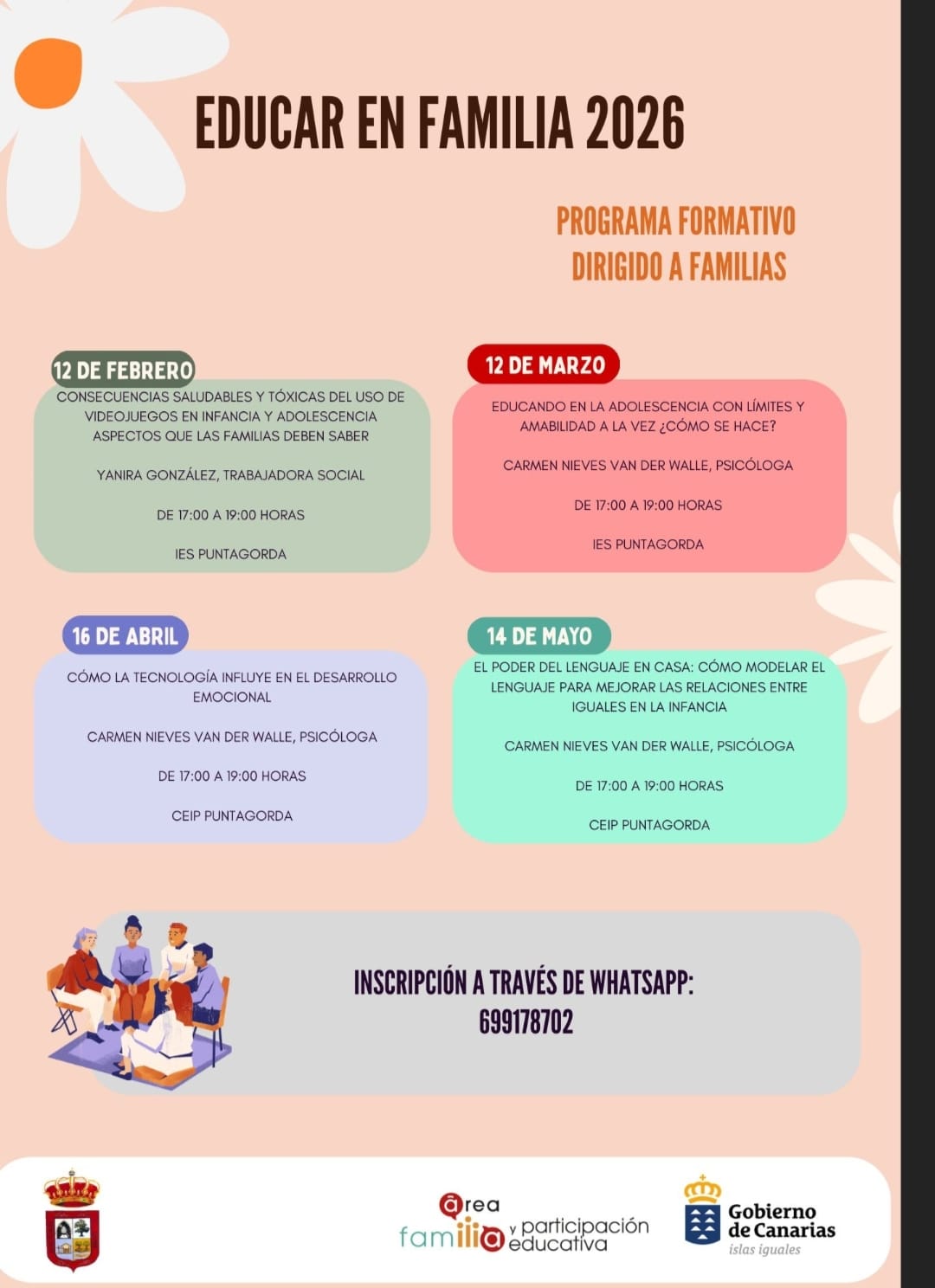 El programa está organizado por el Área de Familia y Participación Educativa del Gobierno de Canarias, en colaboración con las Concejalías de Servicios Sociales y Educación del Ayuntamiento de Puntagorda. Además, se ofrecerá servicio de guardería, con el objetivo de facilitar la participación de las familias.