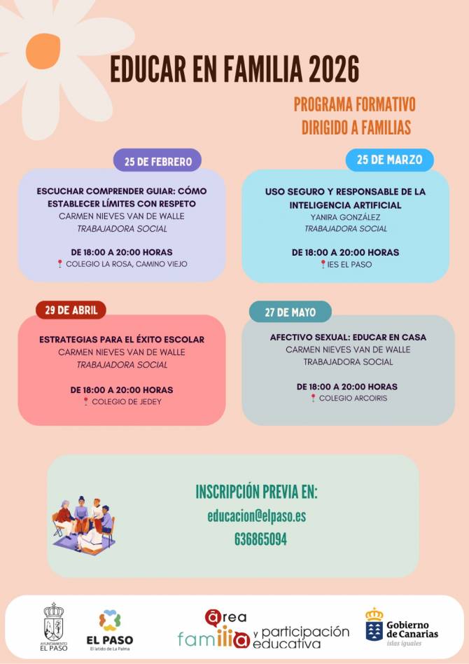 El alcalde de El Paso, Eloy Martín, destaca “la continuidad de este programa y las sinergias entre administraciones y agentes educativos. Esta nueva edición incluirá talleres especializados entre febrero y mayo, que se celebrarán en los centros educativos del municipio, acercando la formación a nuestros barrios y facilitando la participación de las familias en su entorno más cercano”.