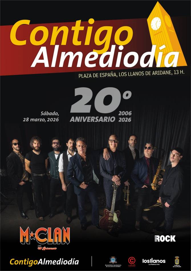 El Ayuntamiento de Los Llanos de Aridane celebra el XX aniversario de Contigo Almediodía con un concierto de M-Clan el próximo 28 de marzo, a las 13:00 horas, en la plaza de España. La actuación forma parte de una programación especial que conmemora dos décadas de música en directo en el corazón del municipio, consolidada como una de las propuestas culturales más singulares de La Palma.