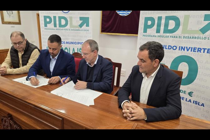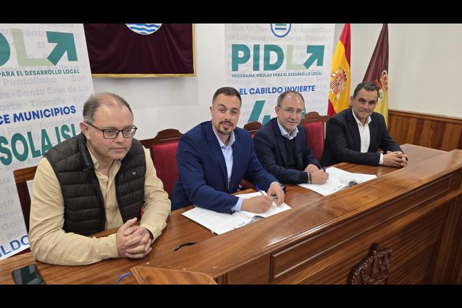 El Cabildo de La Palma destina 2,4 millones de euros con cargo del Plan de Desarrollo Local (PIDL) a la mejora de infraestructuras en Villa de Mazo. El presidente insular, Sergio Rodríguez, y el alcalde de Villa de Mazo, Idafe Hernández, han suscrito el convenio de colaboración de este programa que dotará al municipio de más de 600.000 euros al año para la puesta en marcha de proyectos clave para la localidad. Con la rúbrica con este municipio, los 14 de la Isla ya han formalizado su adhesión al PIDL.