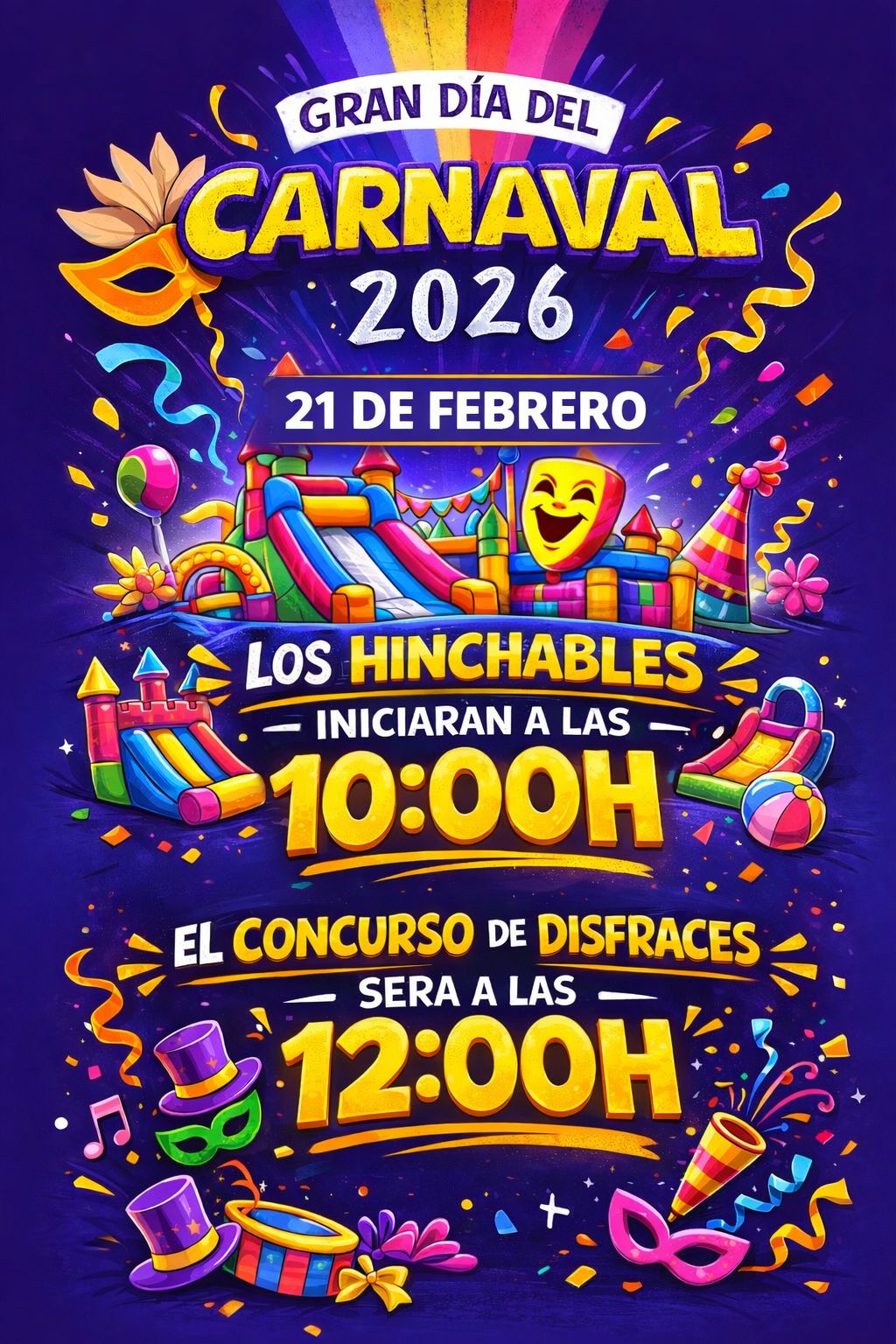 La programación continuará este sábado, 21 de febrero, con el Carnaval Infantil de Piñata, a partir de las 11:00 horas en el Recinto Central del Carnaval, con hinchables, talleres, animación y concurso de disfraces, cuyas inscripciones se realizarán una hora antes en el propio recinto.