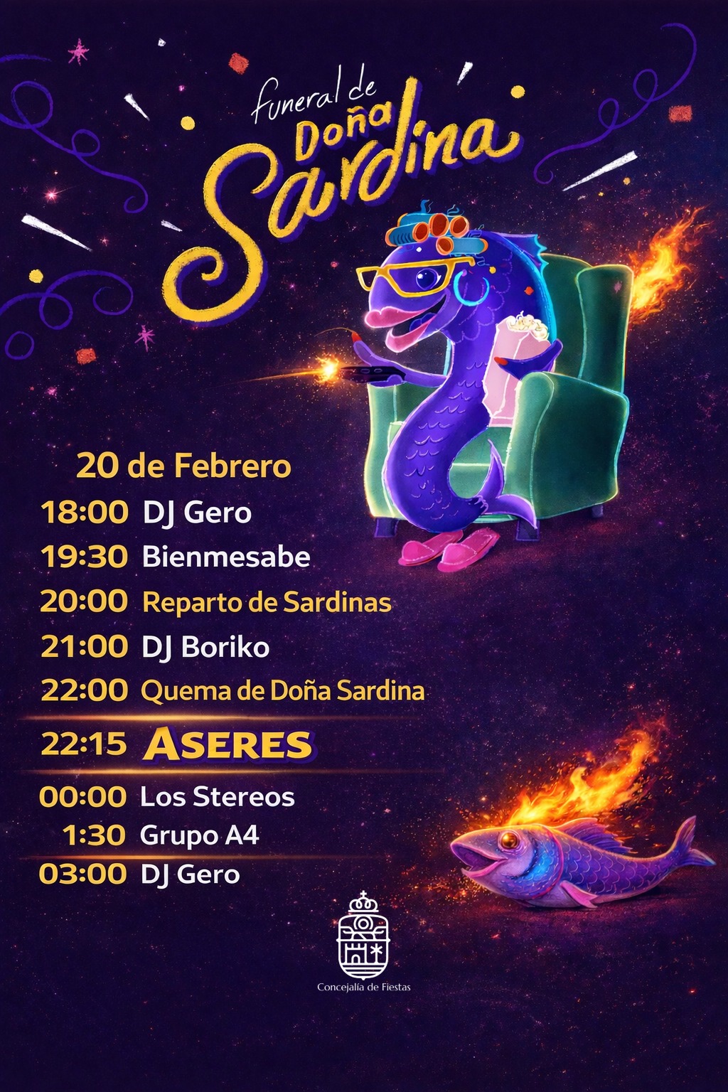 A partir de las 20:00 horas, el Recinto Central acogerá el Funeral de Doña Sardina, con el tradicional reparto de sardinas y las actuaciones de Aseres, Los Stereos, DJ Borikó y Grupo ACuatro, animando la noche hasta el momento culminante.