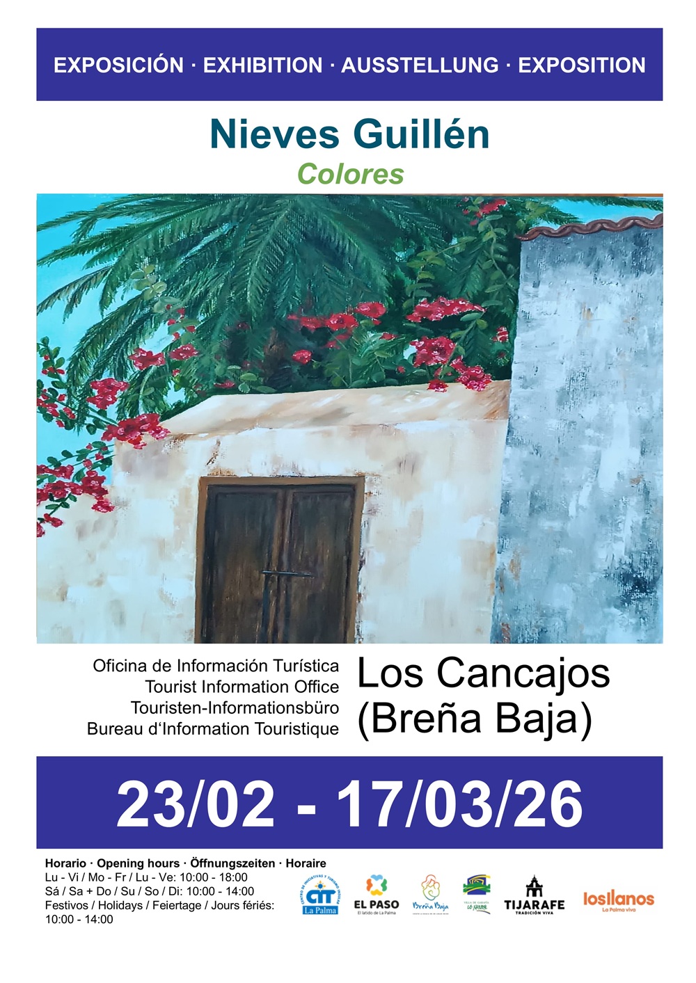 Del 23 de febrero al 17 de marzo la Oficina de Información Turística de Los Cancajos acoge la Exposición de pintura al óleo "Colores" de Nieves Hernández Guillen en los horarios de apertura de la oficina. Con la colaboración del Ayuntamiento de Breña Baja y el Cit Tedote.