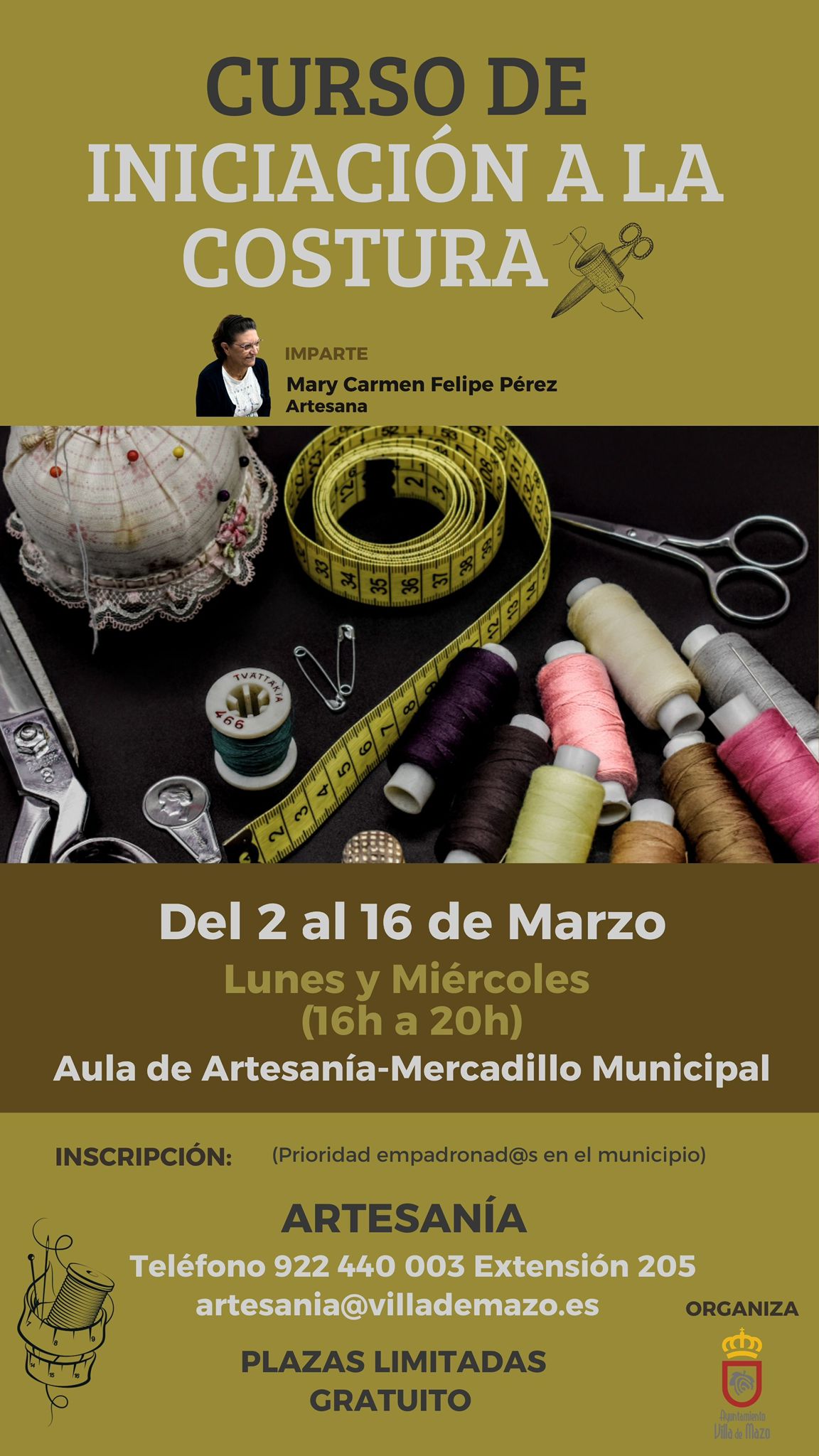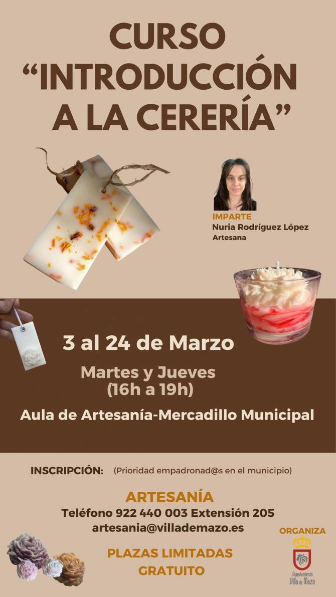 Ambas formaciones son gratuitas y priorizan la participación de personas empadronadas en el municipio. Las inscripciones pueden realizarse llamando al teléfono de Artesanía 922 440 003 (extensión 205) o enviando un correo electrónico a artesania@villademazo.es.