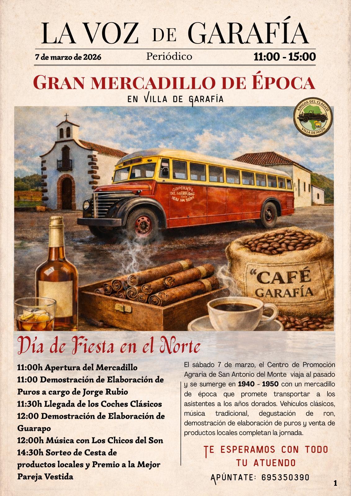 La Villa de Garafía celebra este sábado, 7 de marzo, una nueva edición del Mercadillo, como cada primer sábado de mes, en el Centro de Promoción Agraria de San Antonio del Monte, en horario de 11:00 a 15:00 horas. En esta ocasión, la jornada estará dedicada a los años 40 y 50 con un Gran Mercadillo de Época que promete transportar a vecinos y visitantes a otra etapa de nuestra historia.