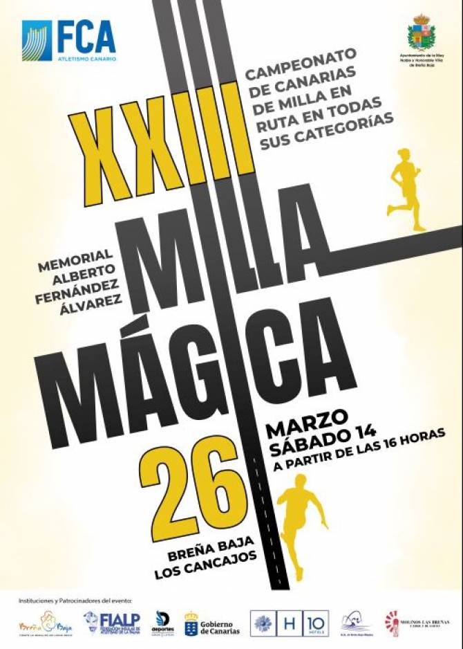 El Ayuntamiento de Breña Baja, la Federación Canaria de Atletismo (FCA) y la Federación Insular de Atletismo de La Palma organizan para el sábado 14 de marzo a las 16 hs en Los Cancajos, la XXIII Milla Urbana “Breña Baja Mágica 2026”, Campeonato de Canarias (en todas sus categorías) y Memorial "Alberto Fernández Álvarez".