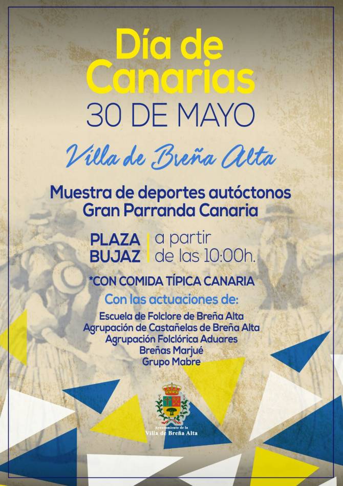La Villa de Breña Alta conmemora el Día de Canarias con una Muestra de Deportes Autóctonos y una Gran Parranda. Las actividades programadas, organizadas por el Ayuntamiento, se celebrarán el próximo martes, 30 de mayo, a partir de las 10:00 horas, en la Plaza Bujaz, donde los miembros de las diferentes asociaciones y colectivos del municipio compartirán una comida típica, de elaboración propia, con los vecinos.