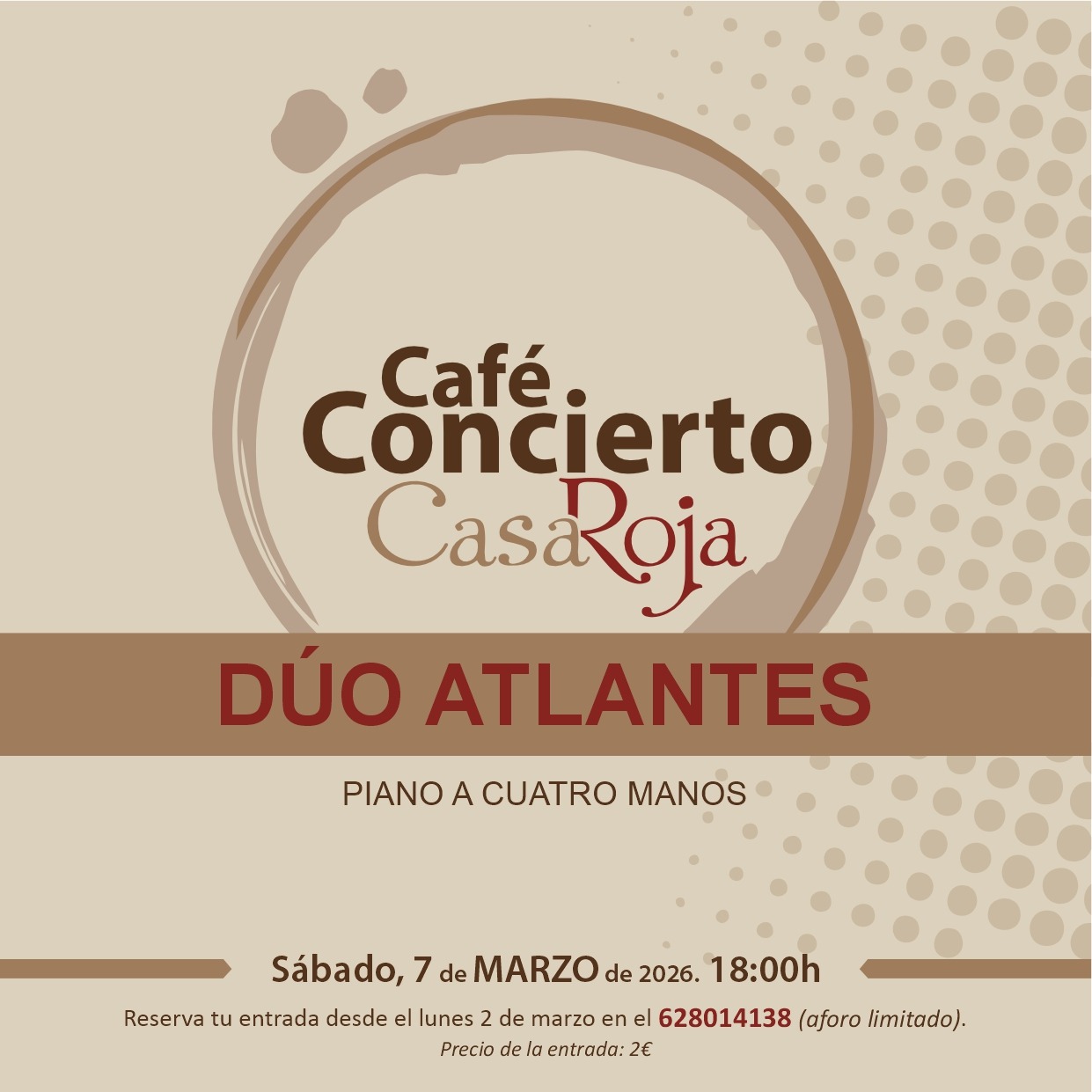El concierto permitirá descubrir el repertorio para piano a cuatro manos, una modalidad de música de cámara en la que dos intérpretes comparten un mismo instrumento. El acceso al Café-Concierto tiene un precio de 2 euros con aforo limitado y las entradas podrán reservarse llamando al 628 01 41 38.