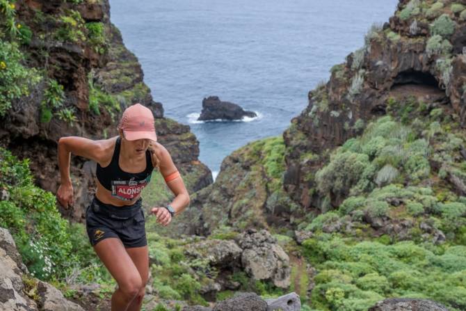 Los Acantilados del Norte no es una cita para los más rápidos ni tan siquiera para los más técnicos... es para los que son capaces de adaptarse al terreno y mimetizarse con él -que se lo digan a nuestros antepasados, sobre todo a los que vivían en el litoral norteño-. Carácter y personalidad. Ser o no ser. Y ahí Sara Alonso es la mejor. Una sonrisa que cubre un ser cuya energía se contagia; una corredora cuya valentía y osadía en las bajadas contrasta con su capacidad analítica -es ingeniera-. Quizá en su mentalidad se fraguó un triunfo que vino aparejado con un nuevo récord en el rutómetro que une Garafía con Barlovento.