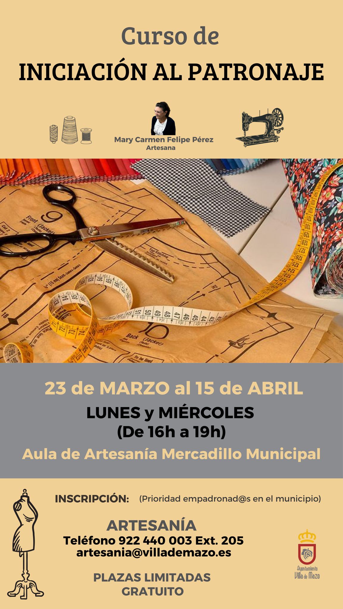 La inscripción es gratuita y está dirigida principalmente a personas empadronadas en el municipio. Las personas interesadas podrán formalizar su inscripción a través del teléfono 922 440 003 (extensión 205) o del correo electrónico artesania@villademazo.es.