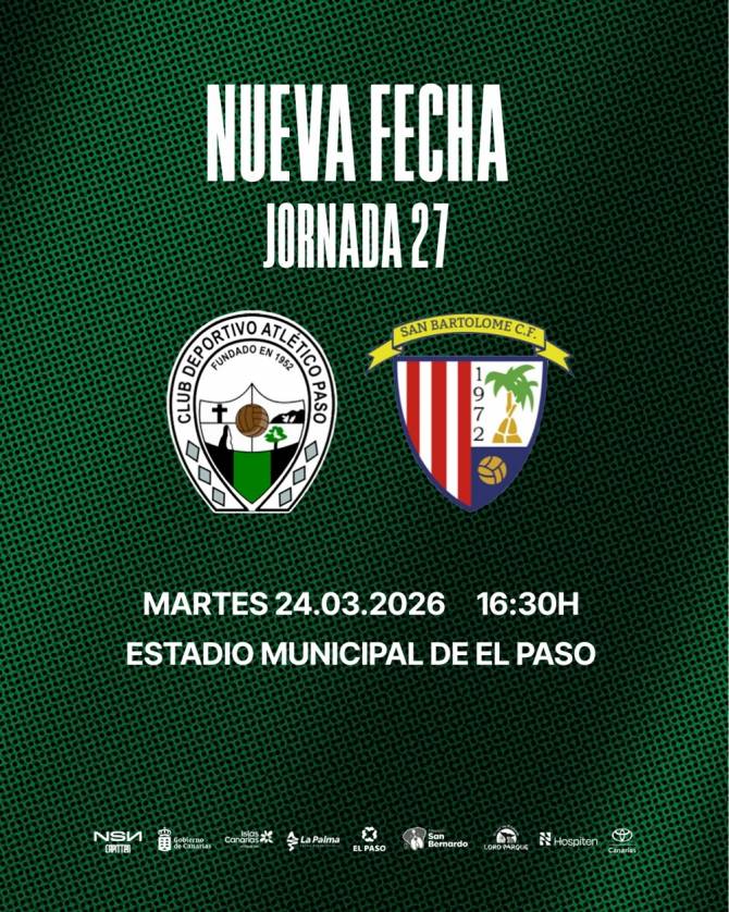 El CD Atlético Paso informa de que el encuentro correspondiente a la Jornada 27 frente al CD San Bartolomé CF, aplazado el pasado fin de semana por la incidencia de la borrasca Therese, se disputará finalmente el martes 24 de marzo, a las 16:30 horas, en el Estadio Municipal de Fútbol de El Paso.