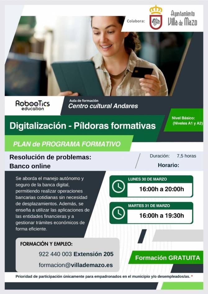 El Ayuntamiento de Villa de Mazo comienza una nueva formación de digitalización centrada en la resolución de problemas con las aplicaciones bancarias, un curso en el que quienes participen podrán realizar sus operaciones cotidianas sin necesidad de desplazarse físicamente. Además, aprenderán a manejar las funciones de las aplicaciones de las entidades financieras y a gestionar distintos trámites digitales.