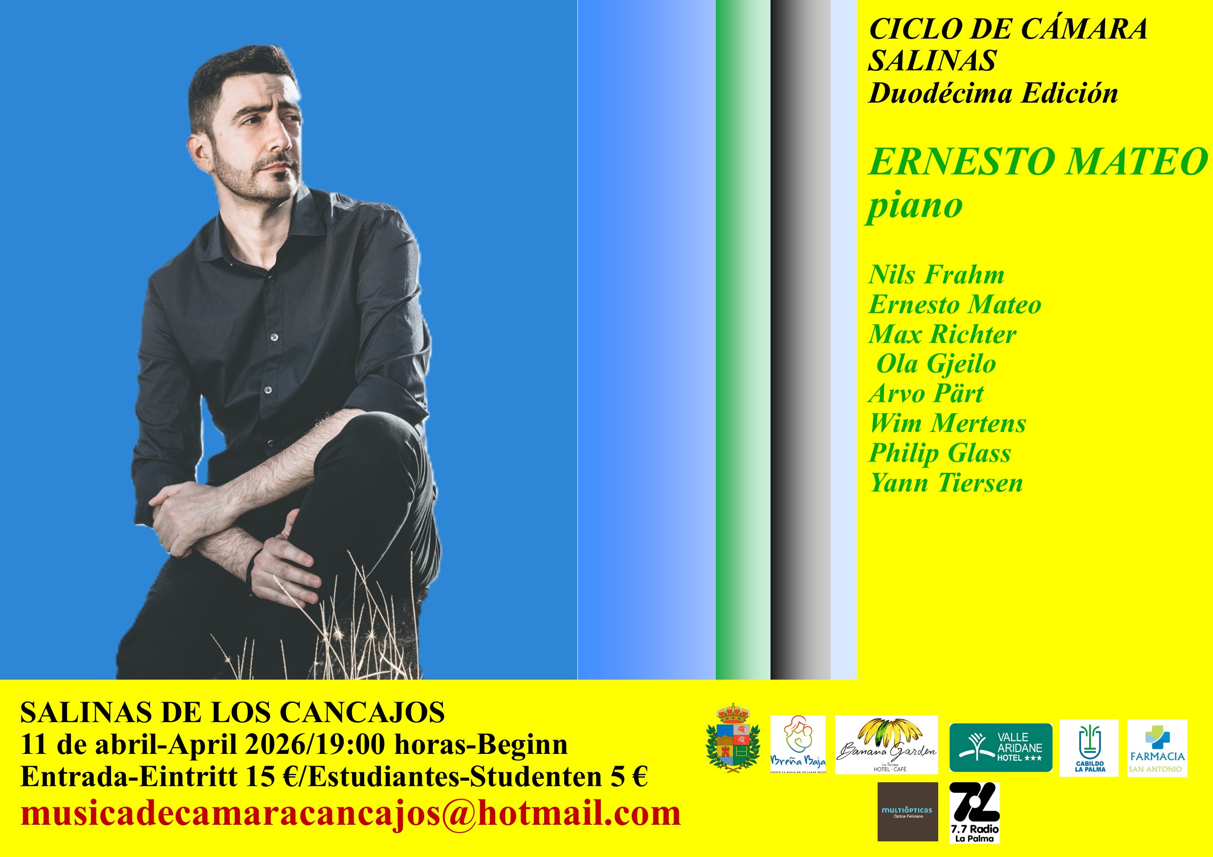 Por su parte, el sábado 11 de abril a las 19 hs, concierto de piano con Ernesto Mateo. Ofrecerá un repertorio centrado en la música minimalista con obras de Nils Frahm: Ode y Hammers, Ernesto Mateo: • Como la primera vez, Estudios 2 y 5 • Hasta que amanezca, Nea y A la velocidad de la luz, Max Richter: On the nature of daylight - Ola Gjeilo: Still, Arvo Pärt: für Alina, Wim Mertens: Close cover, Philip Glass: Opening, Estudios 6 y 9 y Yann Tiersen: Mother’s journey, Comptine nº1 y Amelie.
