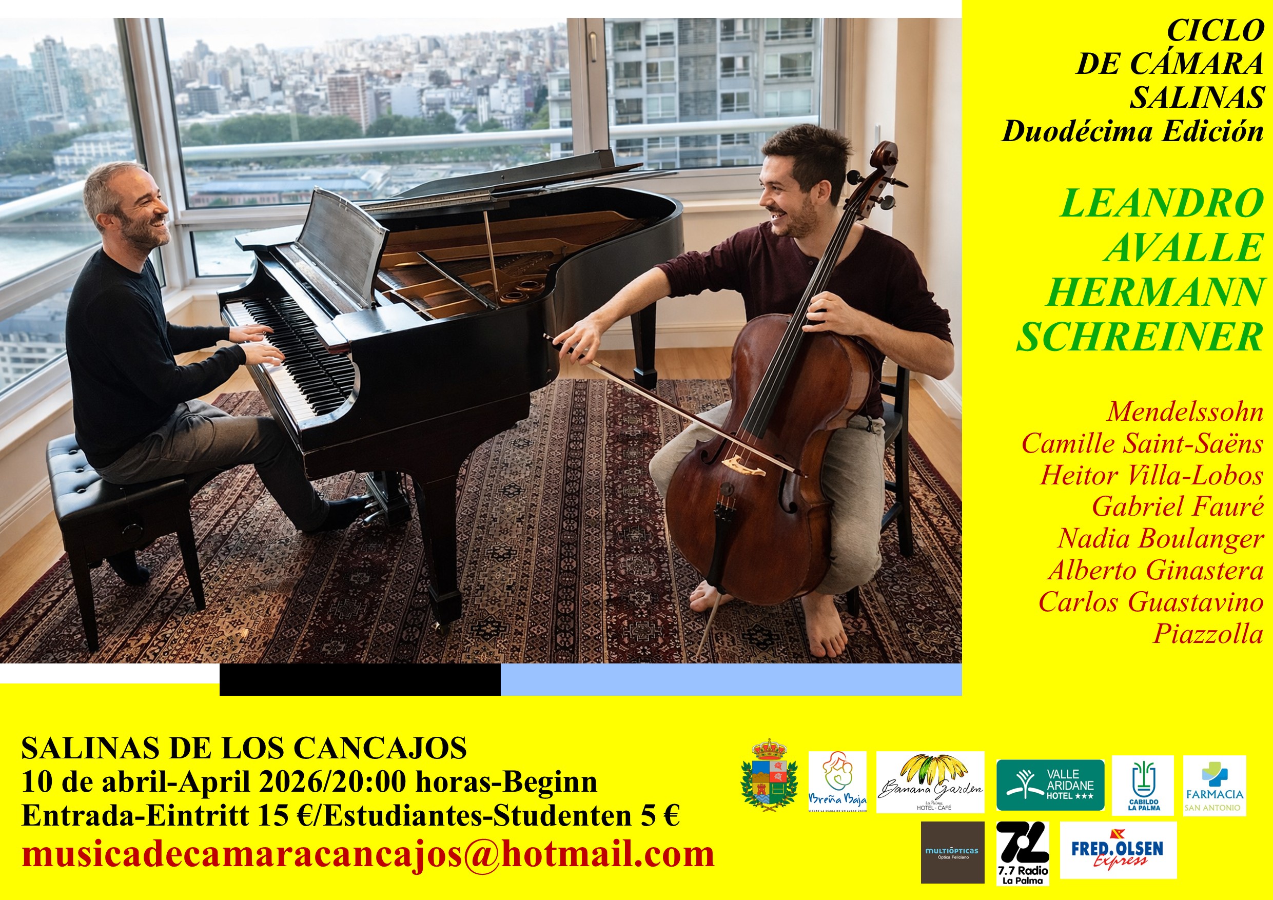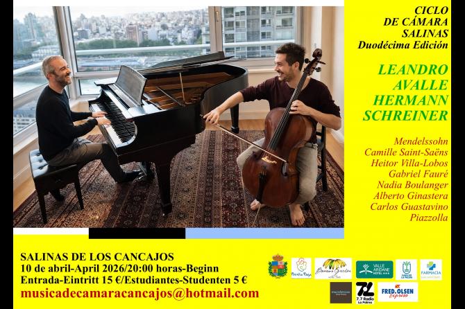 De esta manera, el viernes 10 de abril, a las 20 hs Leandro Avalle (piano) y Hermann Scheriner (violonchelo) nos interpretarán obras de Gustavino, Ginastera, Heitor Villalobos, Piazzolla, Fauré, Mendelssohn y otros.