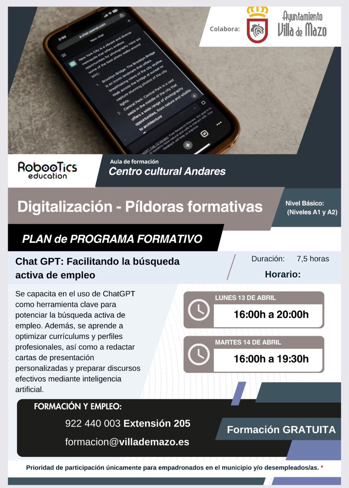 El Ayuntamiento de Villa de Mazo organiza un curso dirigido a facilitar la búsqueda activa de empleo utilizando las nuevas herramientas de inteligencia artificial, concretamente Chat GPT. El curso contará con un total de 7,5 horas de formación y se realizará el lunes 13 de abril, de 16:00 a las 20:00 horas y el martes 14 de abril de, 16:00 a 19:30 horas, en el Aula de formación del Centro Cultural Andares.