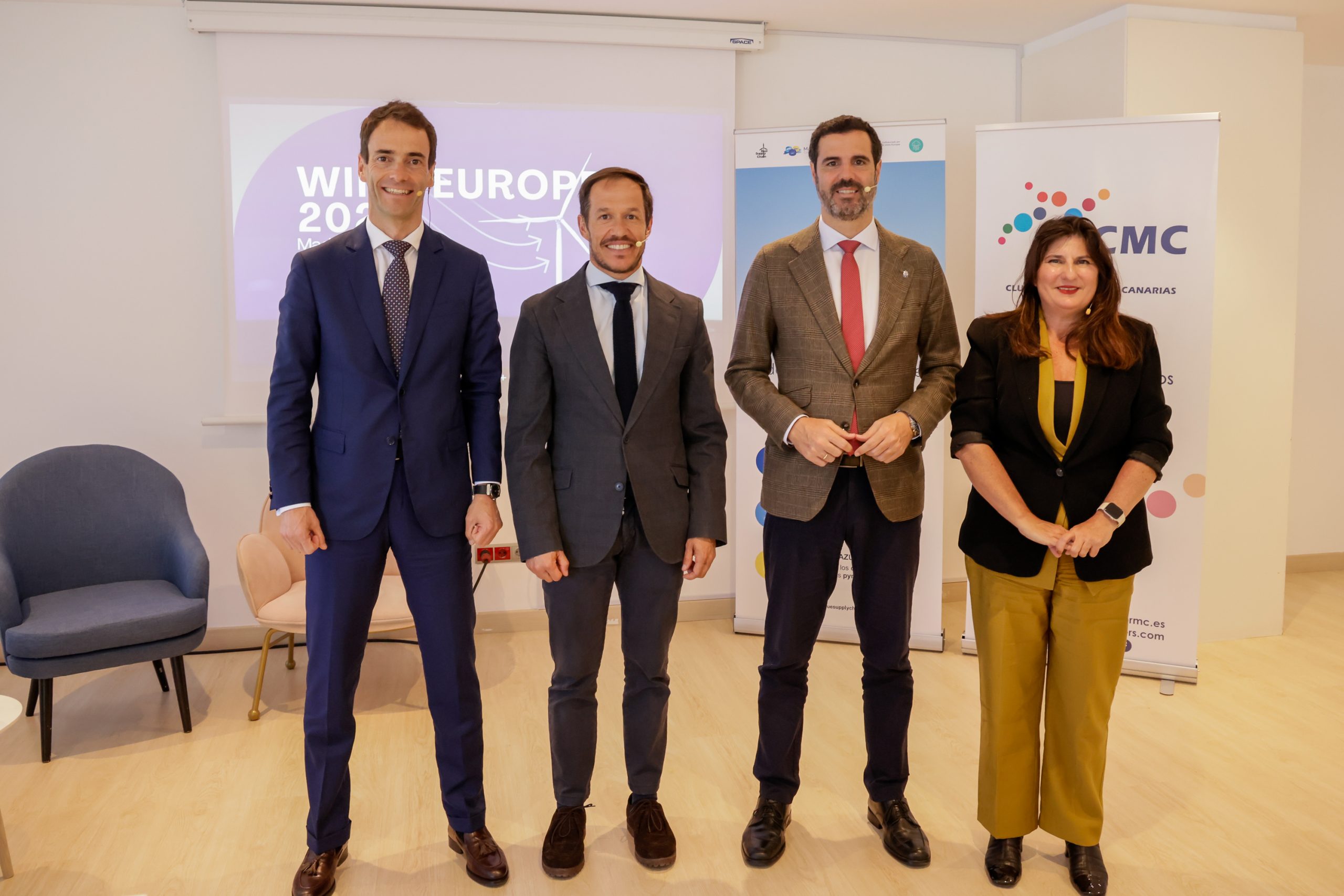 El consejero de Transición Ecológica y Energía del Gobierno de Canarias, Mariano Hernández Zapata; el viceconsejero de Economía e Internacionalización del Gobierno de Canarias y vicepresidente de Proexca, Gustavo González de Vega; el presidente de Astican y del Clúster Marítimo de Canarias, Germán Suárez; y la viceconsejera de Transición Ecológica, Lucha contra el Cambio Climático y Energía, Julieta Schallenberg, han presentado en rueda de prensa este lunes 13 de abril en el Hotel Cristina By Tigotan de Las Palmas de Gran Canaria la puesta en escena para la próxima feria WindEurope que tendrá lugar en Madrid del 21 al 23 de abril en Ifema.