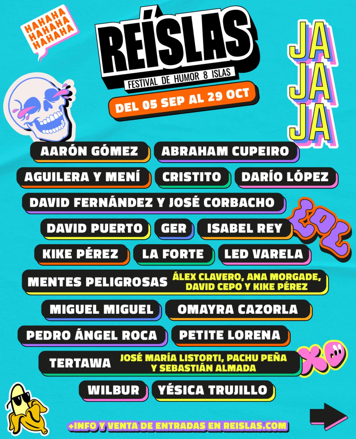 El Festival de Humor 'Reíslas' volverá a celebrarse en todas las islas con un cartel que incluye en su cuarta edición más cómicos y cómicas que nunca. El evento, posicionado en cuarto lugar en el ranking nacional de los festivales de su misma naturaleza, contempla este año en su cartel los nombres de famosos humoristas como David Fernández y José Corbacho, Isabel Rey, Ana Morgade, David Cepo, Wilbur, David Puerto, Ger, Miguel Miguel, Pedro Ángel Roca, Led Varela, La Forte o Aguilera y Mení.
