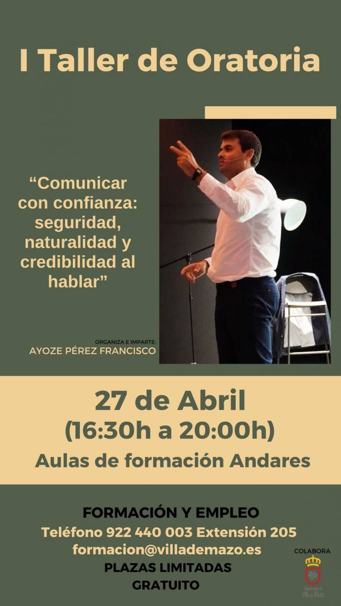 El Ayuntamiento de Villa de Mazo organiza un taller de oratoria, liderado por Ayoze Pérez Francisco, el próximo lunes, 27 de abril. La formación se centra en mejorar la seguridad, la naturalidad y la credibilidad al hablar en público, a través de herramientas y recursos prácticos para reforzar la expresión oral.