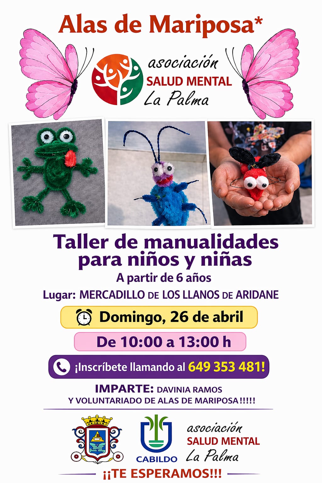 El próximo domingo 26 de abril, a partir de las 10:00 de la mañana, el proyecto Alas de Mariposa desarrollará un taller de manualidades dirigido a niños y niñas a partir de 6 años en el Mercadillo de Los Llanos de Aridane.