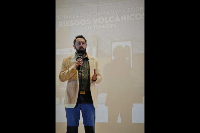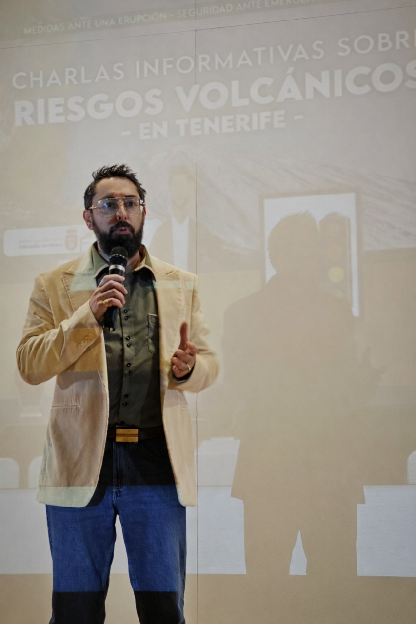 Durante su exposición, repasó de forma divulgativa la actividad volcánica histórica de Tenerife, los diferentes tipos de erupciones —unas más peligrosas que otras— y los principales peligros asociados al vulcanismo —coladas, ceniza, gases, sismicidad o flujos piroclásticos— y sus efectos sobre la salud, las infraestructuras, la agricultura y el transporte.