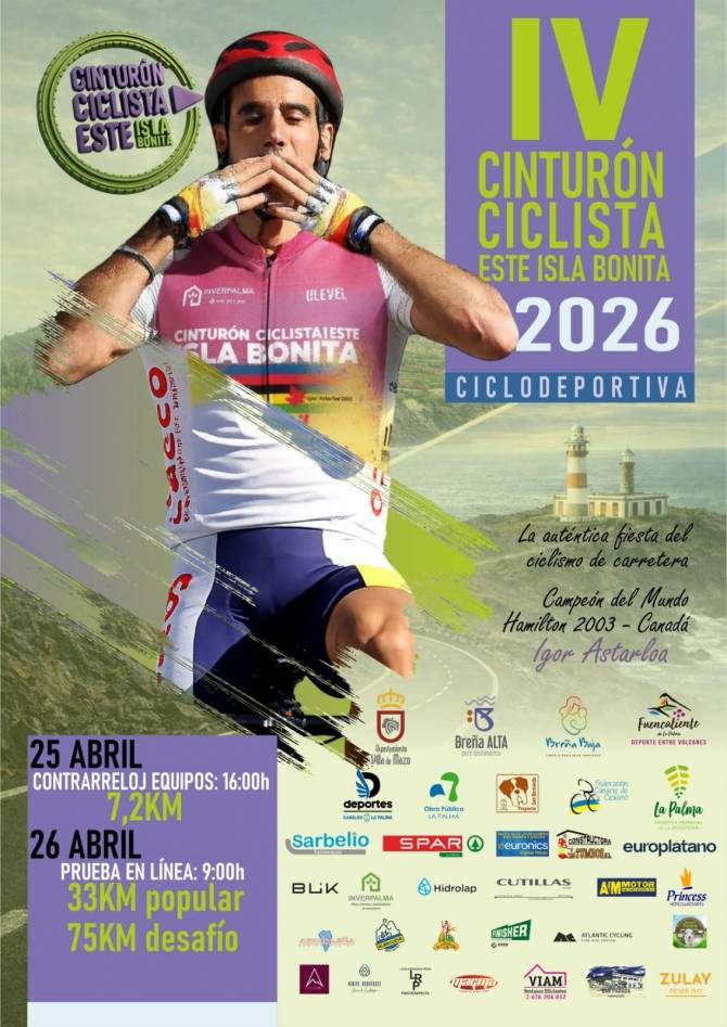 En el programa 2026 del “IV Cinturón Ciclista Este Isla Bonita” contara con varias actividades en el municipio de Breña Baja. El viernes 24 de abril en el salón de plenos del Ayuntamiento Breña Baja (San José), 17 hs, habrá una formación de psicología deportiva, impartido por Néstor Rodríguez Díaz. Seguidamente, se podrá disfrutar de un encuentro abierto sobre ciclismo con el campeón del mundo Igor Astarloa a las 20 hs.