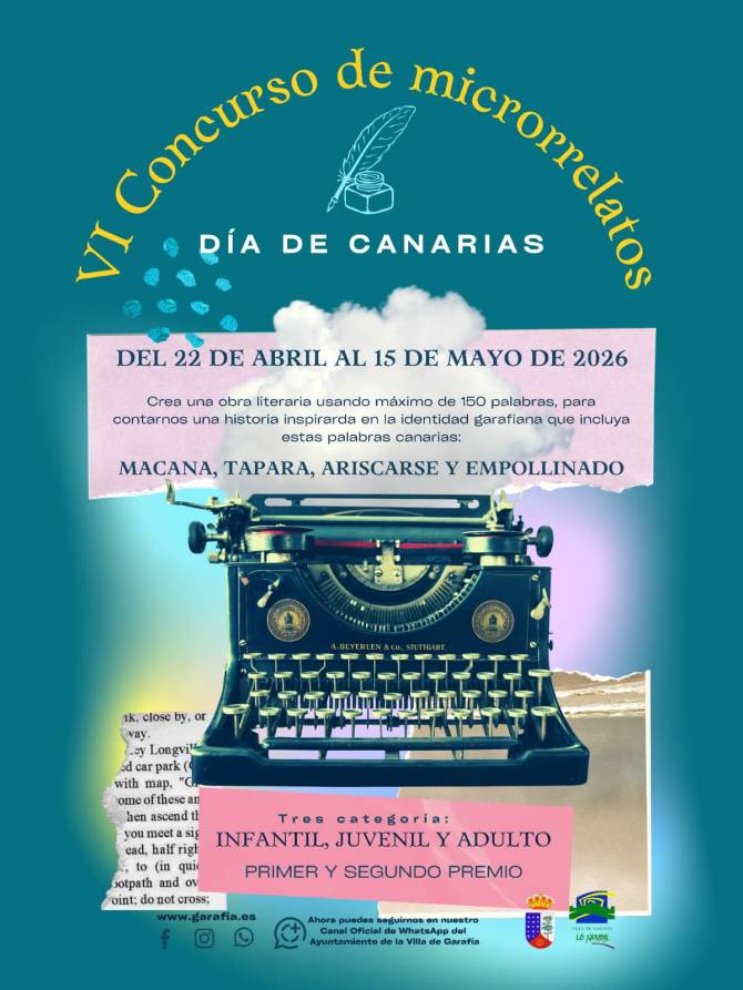 El Ayuntamiento de la Villa de Garafía, a través de su Concejalía de Cultura, ha convocado la sexta edición del Concurso de Microrrelatos con motivo del Día de Canarias, cuyo plazo de presentación de obras se abrió ayer, 22 de abril, y permanecerá disponible hasta el 15 de mayo a las 23:59 horas.