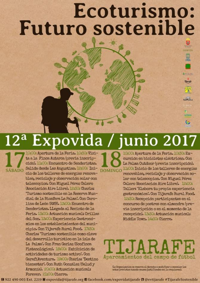 La concejalía de Turismo, Artesanía y Medioambiente del Ayuntamiento de Tijarafe ha presentado el programa de la 12º Edición de la Expovida, que tendrá lugar el 17 y 18 de junio en los aparcamientos del campo de fútbol. Este año, coincidiendo con el Año Internacional del Turismo Sostenible, la Expovida girará en torno al lema “Ecoturismo. Futuro sostenible”.