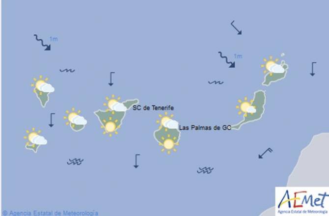 Por encima de unos 1100 a 1300 metros de altitud los cielos estarán despejados. En el Oeste y Norte de la Isla, baja probabilidad de alguna lluvia débil dispersa y ocasional, preferentemente de madrugada.
