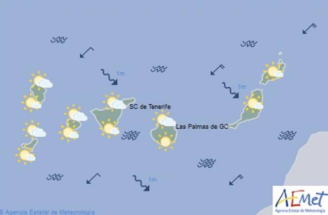 El viento del Nordeste moderado flojo con brisas en costa Suroeste. En medianías y zonas altas componente este flojo.