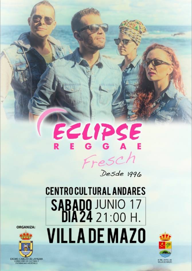 La Consejería de Cultura y Patrimonio Histórico del Cabildo de La Palma, que dirige Primitivo Jerónimo, con la colaboración del ayuntamiento de Villa de Mazo, organiza este sábado 24 de junio a partir de las 21:00 horas el concierto de la formación Eclipse Reggae, que tendrá lugar en el centro cultural Andares de este municipio.