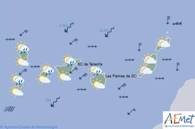 En el Norte, probables lluvias o lloviznas débiles, principalmente a primeras horas y afectando a medianías. En el resto de la isla, poco nuboso o despejado.