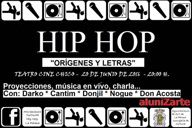 En esta ocasión AluniZarte presenta la actuación del Movimiento Cultural Hip Hop La Palma, formado por Darko, Cantím, Donjíl, Nogue y Don Acosta que se subirán al escenario del Teatro Chico para mostrar sus propias creaciones. La muestra comenzará con una introducción a este mundo artístico y sus elementos, sus inicios y evolución, basándose en la proyección del documental Un micro y dos platos, treinta años de hip hop en España, una aproximación a este lenguaje musical y su progresiva implantación en nuestro país a lo largo de las últimas tres décadas.