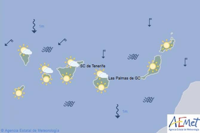 Los cielos estarán en zonas bajas del Norte y Nordeste de la isla, por debajo de unos 400-500 metros de altitud, con intervalos nubosos disminuyendo con claros en horas centrales; en el resto de la isla, poco nuboso a despejado.