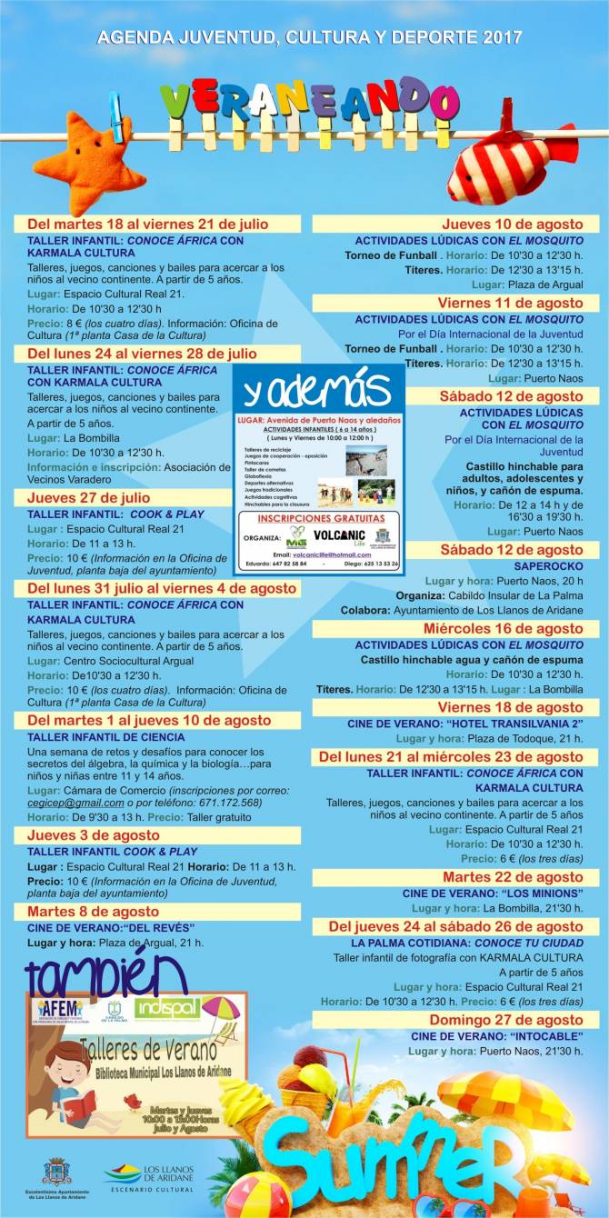 El Ayuntamiento de Los Llanos de Aridane pone en marcha hasta el próximo 27 de agosto un completo programa de actividades culturales, deportivas y de ocio para niños, jóvenes y mayores, que incluye acciones en la práctica totalidad de los barrios aridanenses, muchas de ellas de carácter gratuito.