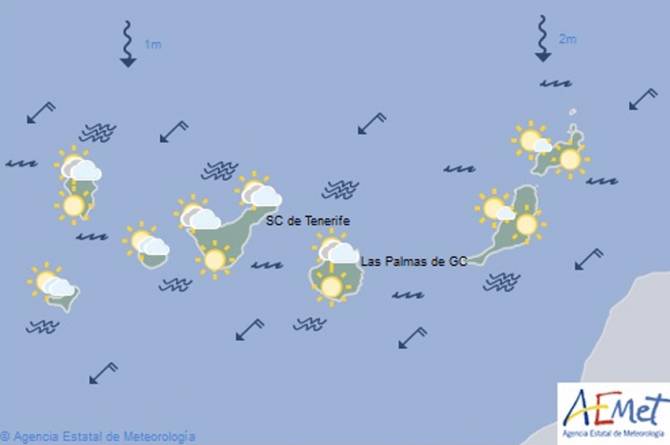 Viento del nordeste moderado, más intenso en costas sudeste y noroeste y en medianías, donde las rachas podrían alcanzar ocasionalmente los 60 km/h. En costa suroeste, variable flojo con brisas.