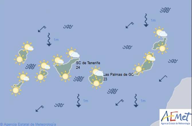 Viento del nordeste de 15 a 25 kilómetros por hora en costas con brisas en horas centrales; en medianías, de nordeste a componente este.