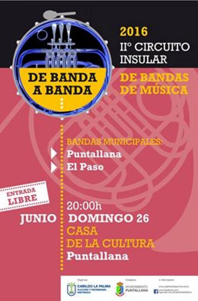 La segunda edición del circuito insular de bandas de música De banda a banda, que organiza el Cabildo de La Palma a través de la Consejería de Cultura y Patrimonio Histórico, que dirige Primitivo Jerónimo, celebra el próximo martes 28 de junio una nueva actuación, en este caso de las bandas municipales de Puntallana y El Paso, que tendrá lugar a partir de las 20:30 horas en la Casa de la Cultura de Puntallana.