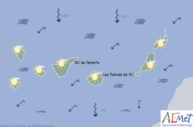 Temperaturas en ligero ascenso en costas, que será moderado en medianías y zonas altas. Se pueden superar los 34ºC en zonas del interior, en medianías del este, sur y oeste; no se descarta que se alcancen localmente los 32 a 34ºC en medianías del norte y en costas.