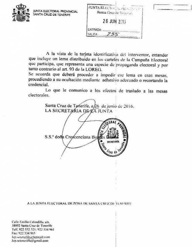 La Junta Electoral Provincial de Santa Cruz de Tenerife ha emitido en el medio día de hoy un oficio en el que obliga a Coalición Canaria a modificar la tarjeta acreditativa de sus interventores "al entender que incluye un lema distribuido en los carteles de la campaña electoral".