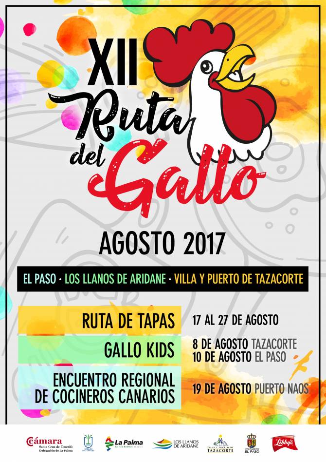 La XII Ruta del Gallo es una iniciativa organizada por la Delegación de la Cámara de Comercio en La Palma y cuenta con el respaldo del Cabildo Insular, a través de la consejería de Agricultura, Ganadería y Pesca, así como de los tres Ayuntamientos de la comarca del Valle de Aridane y las asociaciones empresariales. Además, firmas comerciales como Libbys Canarias y varias empresas locales se han sumado a la Ruta en calidad de patrocinadores de esta iniciativa gastronómica con la que se promocionan los sabores de la cocina palmera y, en particular, los del Valle de Aridane.