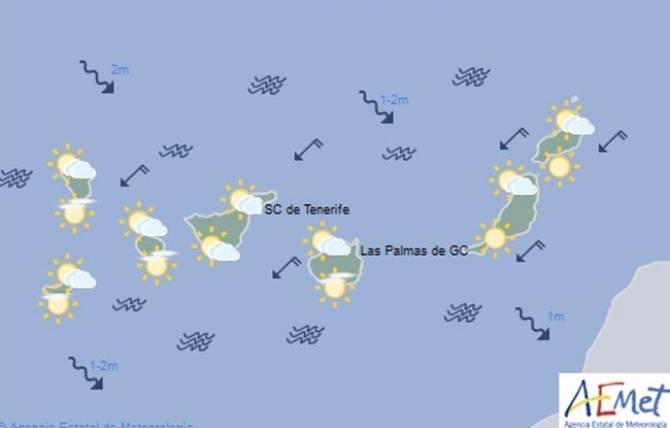 Predominio de cielos poco nubosos o despejados, con algún intervalo de nubes medias y altas, y algún intervalo matinal en los litorales norte y nordeste por debajo de unos 400 metros de altitud. Baja probabilidad de calima.