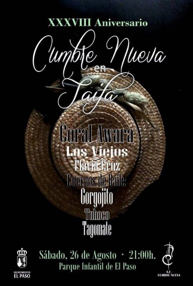 Este sábado desde las 21:00 horas y en el recinto del parque infantil de la Ciudad de El Paso, la agrupación folclórica Cumbre Nueva celebrará su 38 aniversario con la puesta en escena del espectáculo titulado “Cumbre nueva en Taifas”.