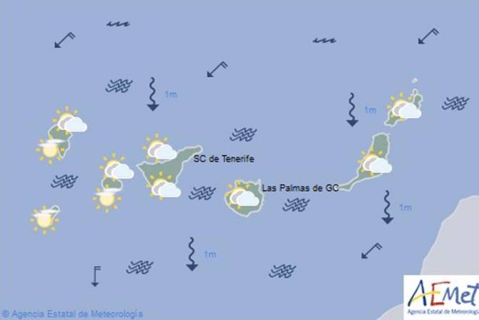 Viento del nordeste de 25 a 35 km/h en costas, con intervalos de fuerte en extremos noroeste y este. Componente este en medianías y del sur en zonas altas.