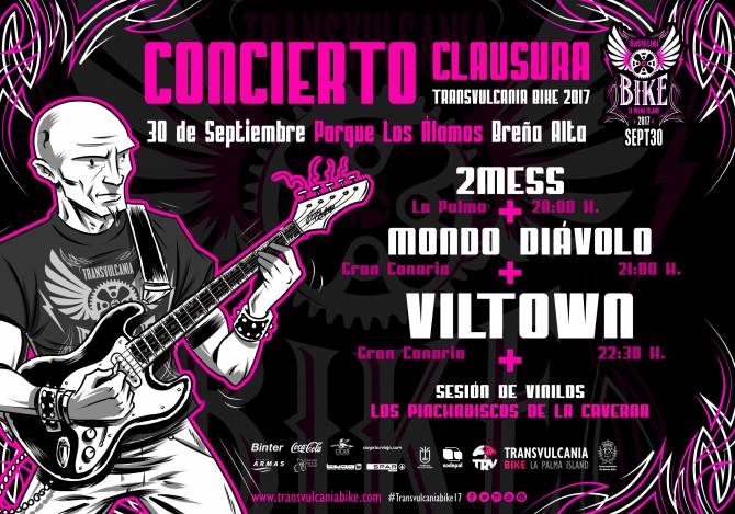 La primera edición de la ‘Transvulcania Bike’ concluirá este próximo sábado, 30 de septiembre, con el concierto gratuito que ofrecerán los grupos 2Mess, Mondo Diávolo y Viltown en el Parque de Los Álamos de Breña Alta, junto a la zona de meta de las modalidades K75 y K30. Las actuaciones darán comienzo a las 20:00 horas y se prolongarán hasta la medianoche. A su vez, se ofrecerá a lo largo de la jornada una sesión de música en vinilos a cargo de los Pinchadiscos de la Caverna.