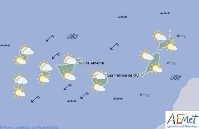 Viento del nordeste entre 25 a 35 km/h, disminuyendo de intensidad durante la tarde, con intervalos de fuerte en extremos noroeste y sureste y en El Paso, sin descartar alguna racha que alcance puntualmente los 60 km/h; en costas nordeste y suroeste, predominio de las brisas.