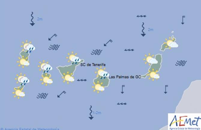 Viento del nordeste, con intervalos de fuerte en extremos noroeste y sudeste, así como en medianías y zonas altas, donde no se descartan rachas que localmente puedan superar los 50 a 60 km/h. Brisas en el litoral suroeste.