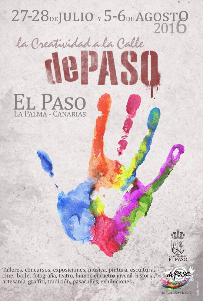 Las calles de El Paso se llenarán los próximos 27 y 28 de julio y los días 5 y 6 de agosto de creatividad, ya que llega una nueva edición del Festival Creativo "dePASO" unas jornadas en las que se pretende aglutinar todo tipo de arte, formas de expresión, destrezas, o cualquier habilidad de las personas con las que se puedan articular modos creativos de expresión.